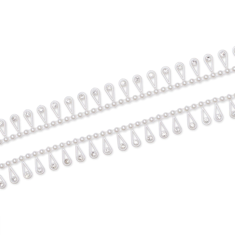 Sold by the spool, shop 5/8 Inch Pearl Teardrops With Diamond Rhinestones On Chain Trim online at wholesale prices today!