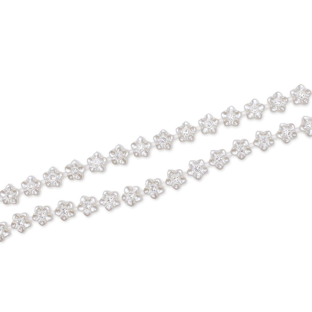 This lightweight and shiny trim features beautifully textured, five-petal flowers measuring 7/16 inch in diameter, each centered with a brilliant 1/8-inch rhinestone diamond. Every flower is attached to two polyester threads and spaced 1/8 inch apart, creating a delicate and refined floral chain. Made from a blend of Polyester, Plastic, Acrylic, and Resin, this trim is 7/16 inches wide, 3.65 mm thick, and weighs 6.16 ounces per 10 yards. The floral design is arranged in a 1/2" horizontal, lengthwise grain pattern, giving it a clean, uniform look across the spool.