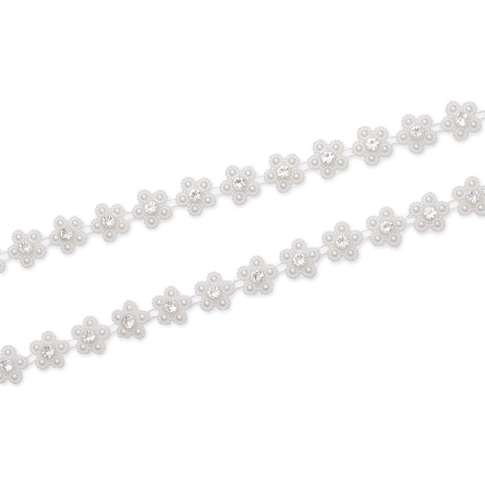 Made from a blend of polyester, plastic, acrylic, and resin, this trim measures 0.56 inches wide and 4.15 mm thick, and each 10-yard spool weighs approximately 4.64 ounces. Its combination of pearl-detailed petals and sparkling rhinestone centers creates a polished floral look ideal for apparel and décor.