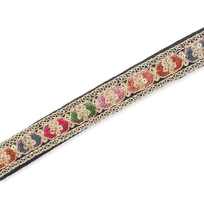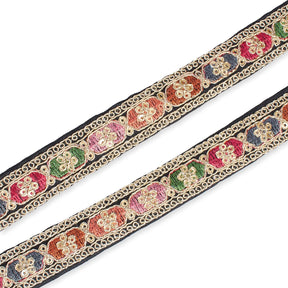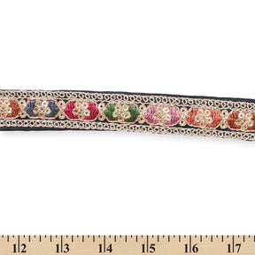0.75 Inch Multicolored Embroidered Two Tone Plain Woven Corded Sequin Trim is a subtly textured, shiny, and colorful textile. This trim displays a 5 inch horizontally repeating pattern that is comprised of embroidery, sequins, and cording, which are secured to a two tone, plain woven backing. Measuring 0.75 inches in width, 0.75 Inch Multicolored Embroidered Plain Woven Corded Sequin Trim is 1.75 millimeters thick, and weighs approximately 5.9 ounces per 9.8 yard (9 meter) pack.