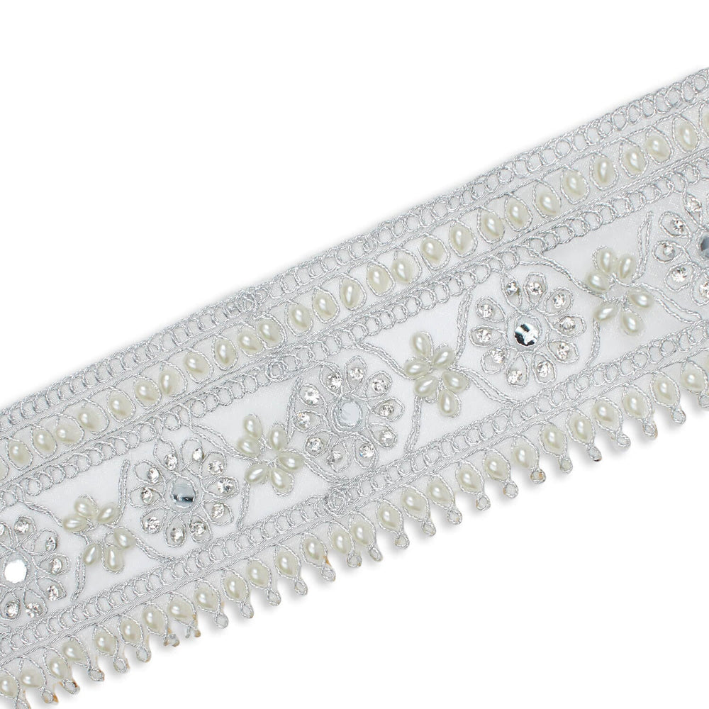 Weighing approximately 11.8 ounces per 9.8 yard (9 meter) pack, 2.5 Inch Daisy Flower Rhinestone Beaded Metallic Cording On Mesh Lace Trim is perfect for accenting dresses, gowns, sarees, and dancewear, or for adding decorative flair to home decor items like tablecloths, curtains, and pillows.