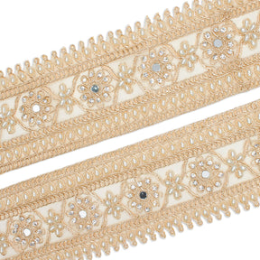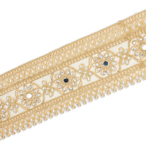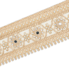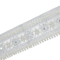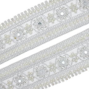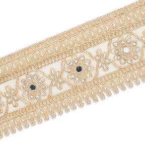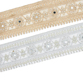 2.5 Inch Daisy Flower Rhinestone Beaded Metallic Cording On Mesh Lace Trim is a bold, floral-inspired embellishment made to add elegance and sparkle to any project. Crafted from 100% polyester mesh and adorned with radiant rhinestones, shimmering beads, and metallic cording, this trim features a beautiful daisy flower pattern that repeats every 1.75 inches horizontally. The mesh lace base adds a delicate, see-through texture, while the 2.5-inch width and 2.5 mm thickness provide structure and presence.