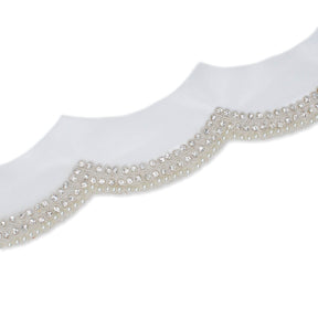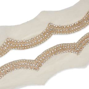 3 Inch Scalloped Regal Rhinestones Beads & Metallic Cording On Polyester Mesh Trim is a dazzling, textured trim crafted to bring bold elegance and sparkle to any project. Made from 100% polyester mesh, this trim features a 3-inch horizontally repeating scalloped design adorned with radiant rhinestones, shimmering beads, and metallic cording, creating a luxurious, dimensional effect.