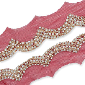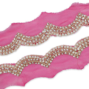 3 Inch Scalloped Regal Rhinestones Beads Metallic Cording On Polyester Mesh Trim SV581908 Fuchsia A1