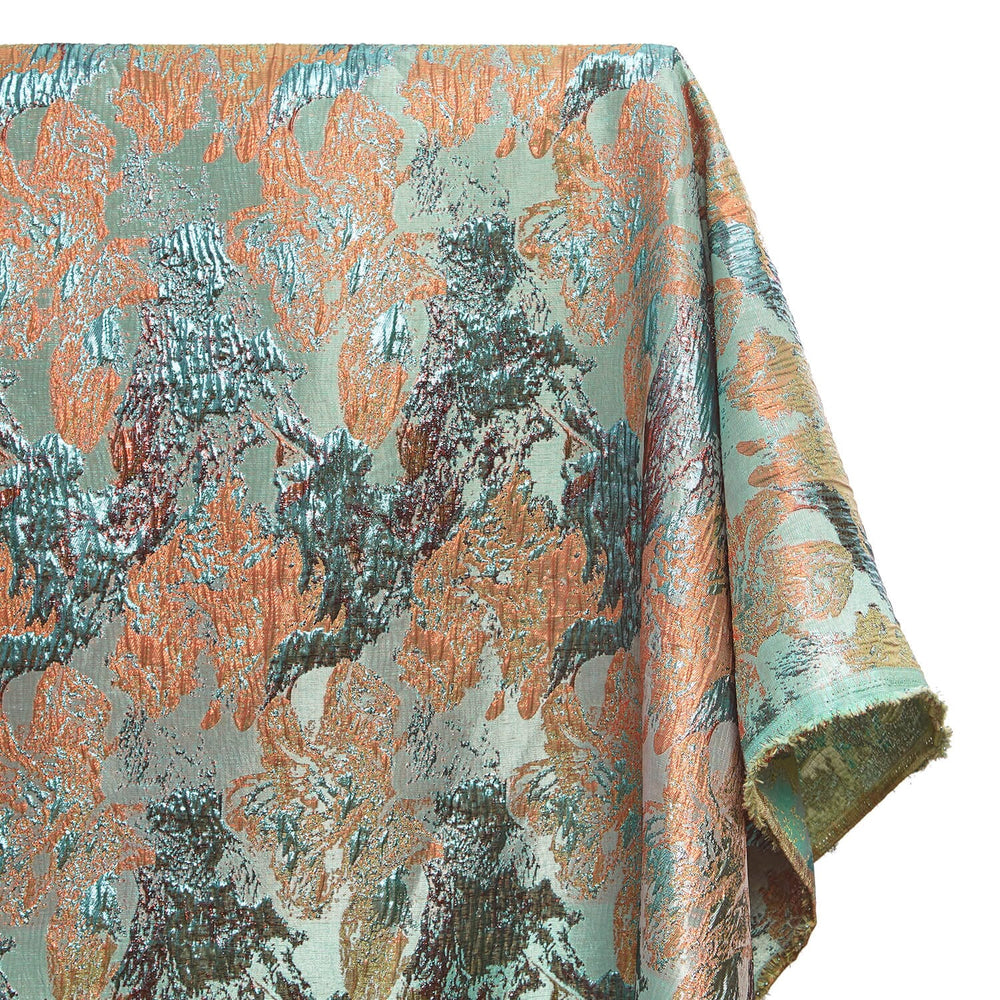 Abstract Plain Woven Crinkle Metallic Brocade Jacquard is a shiny, subtly textured, and multi colored fabric. Made from 100% polyester fibers, this fabric is plain woven with 3 different types and sizes, of varying colored yarns. Abstract Plain Woven Crinkle Metallic Brocade Jacquard displays an abstract design and features a crinkle texture, which are woven into the fabric itself. Furthermore, the patterns on the design repeat every 7 inches vertically, and 14 inches horizontally. Measuring 56/57 inches wide, Abstract Plain Woven Crinkle Metallic Brocade Jacquard fabric is 0.45 millimeters thick, has a 140 GSM, and weighs approximately 8.3 ounces per linear yard.