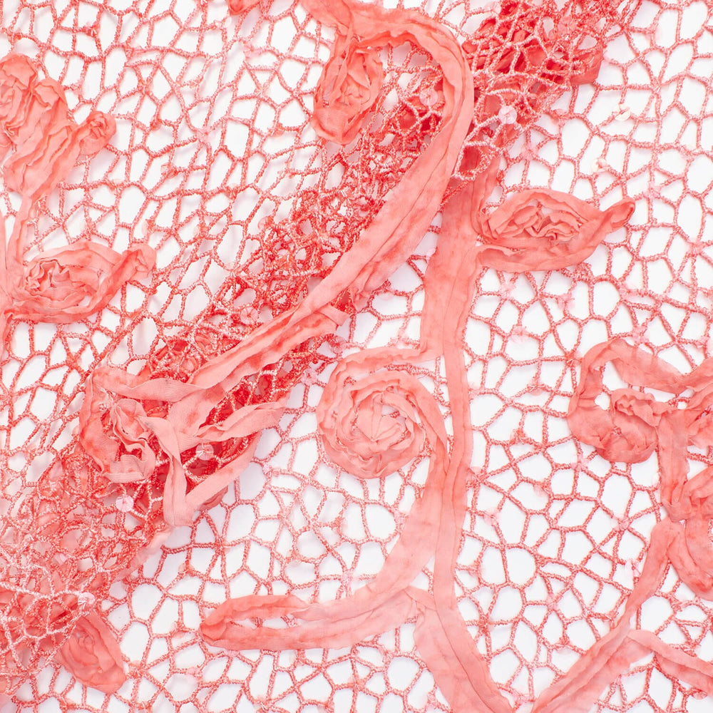 This chemical mesh lace is 52" wide and is 100% polyester. The ruffled ribbon embroidery features a tie-dye color effect and forms a blooming floral design with a flowy lace backing. The chemical mesh lace is also embroidered with transparent colored sequins for an additional shine to the fabric. With it's metallic look, this lustrous chemical lace is sure to stand out at any event. This wonderful embroidery is perfect for your home decorations, apparel, dresses, blouses, crafts and more. Use this fabric as a crafts and apparel product to brighten up your home, church, special occasions, schools and more!