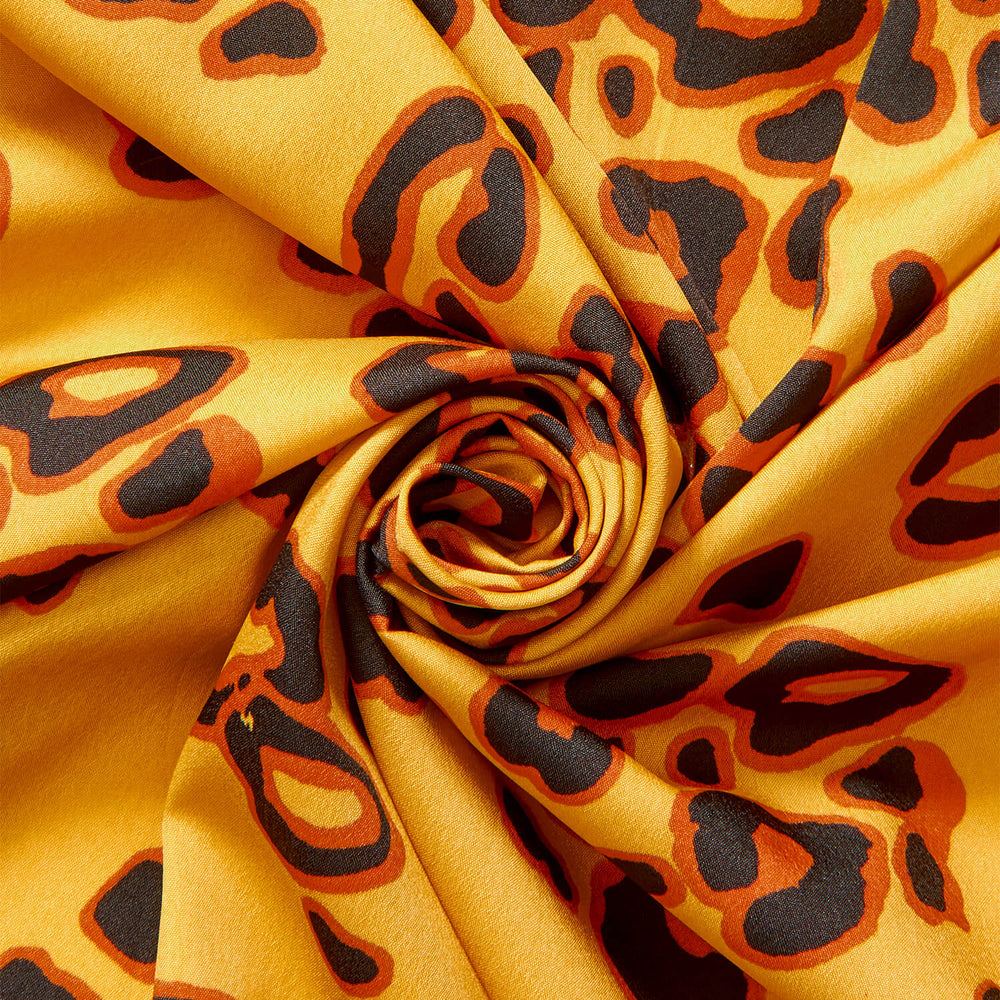 Clouded leopard crepe de chine print is a see-through, breathable, and lightweight fabric that features a vibrant leopard spotted pattern all throughout the fabric. Smoothly textured and slightly crisp, Clouded leopard crepe de chine print fabric is woven in a plain weave style with highly twisted yarns. Clouded leopard crepe de chine print fabric is made from 100% polyester fibers, measures 56/57 inches in width, has a 70 GSM, weighs approximately 3.6 ounces per linear yard, and is 0.17 millimeters thick. Featuring an intricate big cat design, the pattern on clouded leopard crepe de chine print fabric has a vertical repeat of 7 inches and a horizontal repeat of 8 inches. Shop clouded leopard crepe de chine print fabric by the yard or in bulk by the roll.