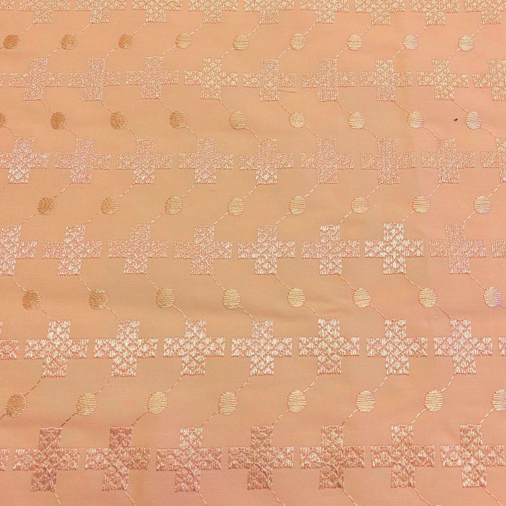 This eyelet embroidery fabric is 45" inches wide and 100% polyester. This wonderful fabric is embroidered with a cross design that is aligned all throughout the fabric.The fabric also features small embroidered circles that are neatly patterned around the cross designs. Both of the designs are embroidered using a shimmery thread that provides a pleasant sheen in the light. It also creates a naturally soothing raised texture for one to run their hands over.
