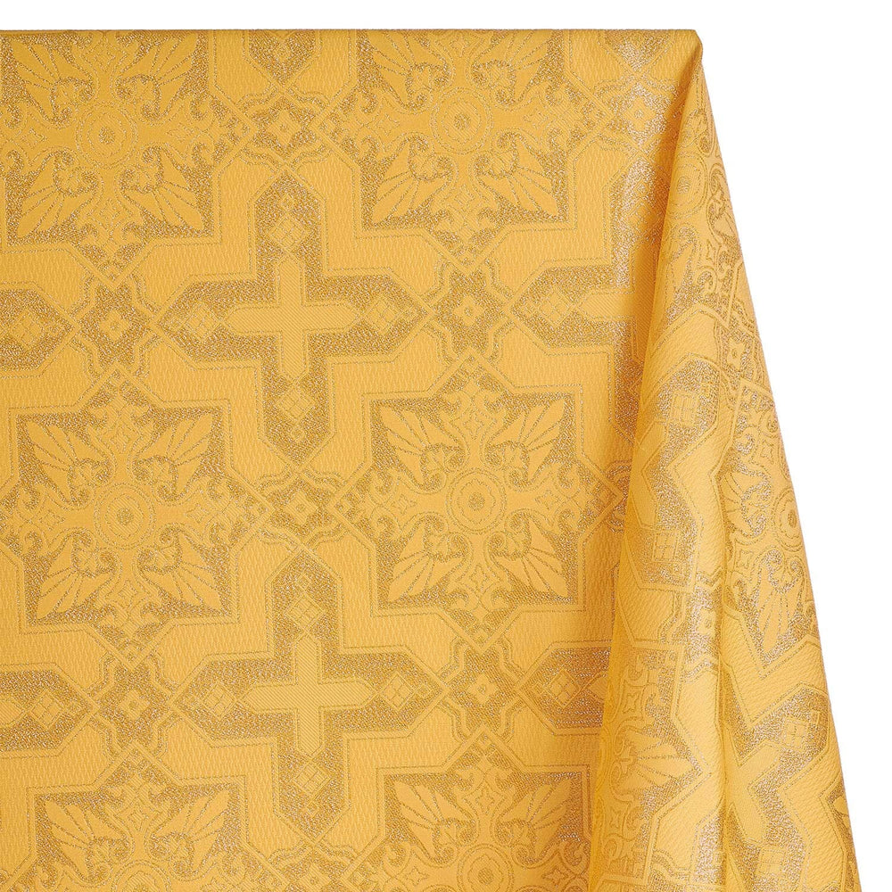 Ecclesiastical Metallic Brocade is a shiny and textured fabric that displays an elegant, double cross pattern all throughout the material. Woven from a blend of 75% polyester and 25% metallic fibers, Ecclesiastical Metallic Brocade is made in a jacquard style, on a loom, where the pattern is woven into the fabric itself. Due to how it’s manufactured, this wrinkle-resistant fabric displays a geometric, double cross pattern, that repeats every 7.5 inches, both vertically and horizontally. Measuring 58/60 inches wide, Ecclesiastical Metallic Brocade fabric is 0.36 millimeters thick, has a 145 GSM, and weighs approximately 7.5 ounces per linear yard. When compared to our other brocades, Ecclesiastical Metallic Brocade is lighter in weight and has a light, airy drape when its hung. Use Ecclesiastical Metallic Brocade for a variety of stylish applications.