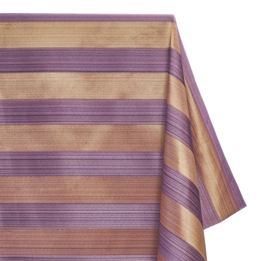 Extra Wide Striped Upholstery Jacquard is a lustrous fabric that displays a textured and multi colored striped geometric pattern woven into the fabric itself. Sourced from durable, easy to clean, and wrinkle resistant, 100% polyester fibers, this fabric is woven on a jacquard loom with a single colored warp yarn that forms the background, and various colored weft yarns that make up the detailed motif. The slightly shiny lined pattern on Extra Wide Striped Upholstery Jacquard fabric runs vertically, parallel to the selvedge, and repeats every 6 inches vertically. Extra Wide Striped Upholstery Jacquard measures 118 inches wide, is 0.40 millimeters thick, has a 190 GSM, and weighs approximately 19.5 ounces per linear yard. This fabric also has a medium thickness and weight, resulting in a full, heavy drape and flow when it is hung.