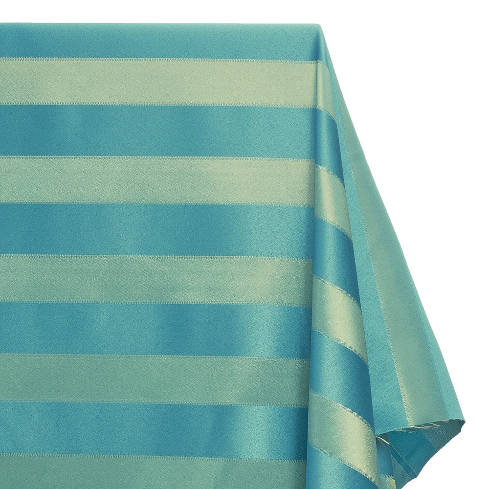 Extra Wide Striped Upholstery Jacquard is a lustrous fabric that displays a textured and multi colored striped geometric pattern woven into the fabric itself. Sourced from durable, easy to clean, and wrinkle resistant, 100% polyester fibers, this fabric is woven on a jacquard loom with a single colored warp yarn that forms the background, and various colored weft yarns that make up the detailed motif. The slightly shiny lined pattern on Extra Wide Striped Upholstery Jacquard fabric runs vertically, parallel to the selvedge, and repeats every 6 inches vertically. Extra Wide Striped Upholstery Jacquard measures 118 inches wide, is 0.40 millimeters thick, has a 190 GSM, and weighs approximately 19.5 ounces per linear yard. This fabric also has a medium thickness and weight, resulting in a full, heavy drape and flow when it is hung.