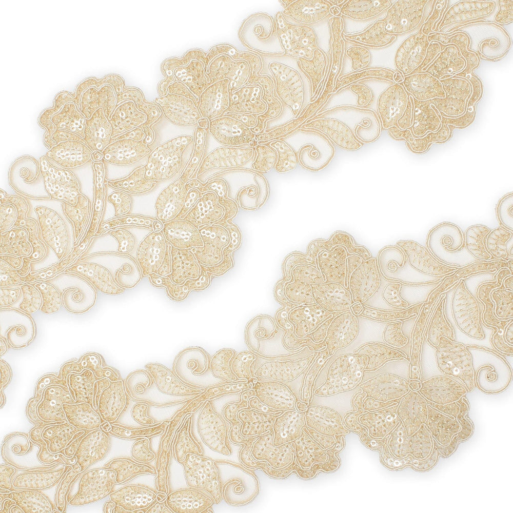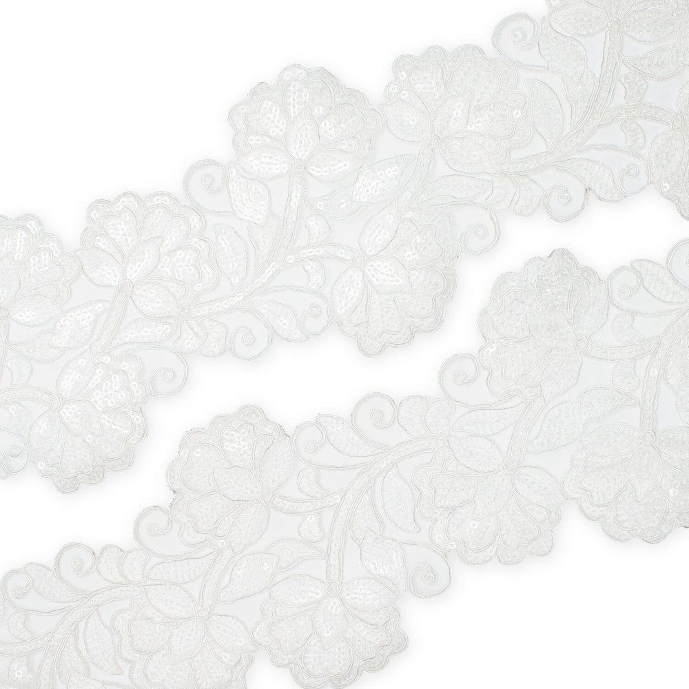 Floral Vine Corded Sequin Embroidery On 4 Inch Scalloped Mesh Lace Trim is a translucent, lightweight, and lustrous hem facing. Sourced from 100% polyester fibers, this trim displays a floral motif made of embroidery, sequins, cording, and scalloped edges. The lengthwise design on Floral Vine Corded Sequin Embroidery On 4 Inch Scalloped Mesh Lace Trim has a 5-inch horizontal (parallel to the selvedge) pattern repeat. Measuring 2/4 inches wide, this trim is 1.25 millimeter thick, and is sold in 4.9-yard (4.5 meter) or 9.8-yard (9 meter) packs, which weigh approximately 4.4 ounces or 8.6 ounces respectively.