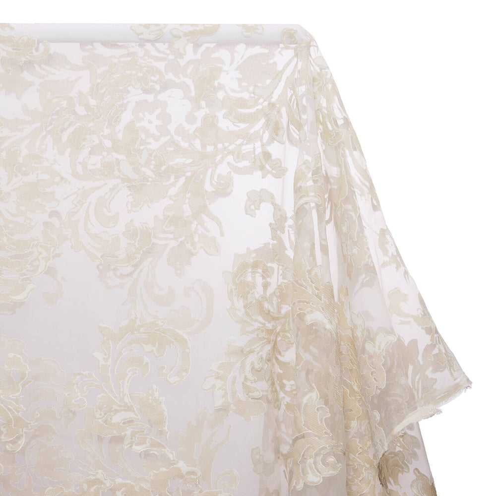 Floral Vine Extra Wide Burnout Polyester Rayon Jacquard On Organza is a see-through and textured fabric that displays a intricate flower pattern. Made from a 80% rayon and 20% polyester blend, this material displays a floral, burnout design, where some areas are more translucent than in other areas. Additionally, the non-directional design flower motif on Floral Vine Extra Wide Burnout Polyester Rayon Jacquard On Organza repeats every 25 inches vertically (measured from selvedge to selvedge), and 25 inches horizontally (measured parallel to the selvedge). At an extra wide 116/118 inches in width, this textile is 0.25 millimeters thick, has a 55 GSM, and weighs approximately 6.9 ounces per linear yard.