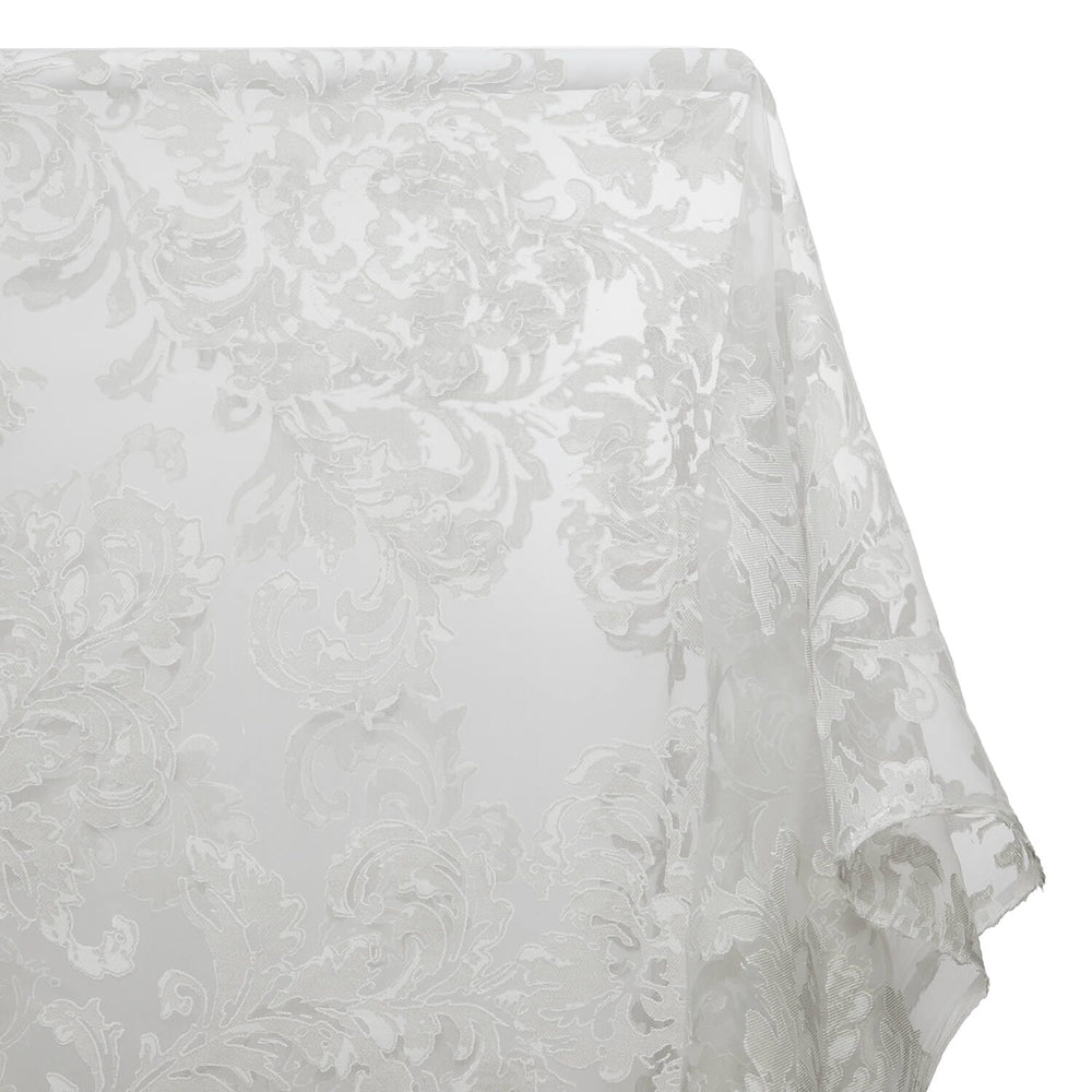 Floral Vine Extra Wide Burnout Polyester Rayon Jacquard On Organza is a see-through and textured fabric that displays a intricate flower pattern. Made from a 80% rayon and 20% polyester blend, this material displays a floral, burnout design, where some areas are more translucent than in other areas. Additionally, the non-directional design flower motif on Floral Vine Extra Wide Burnout Polyester Rayon Jacquard On Organza repeats every 25 inches vertically (measured from selvedge to selvedge), and 25 inches horizontally (measured parallel to the selvedge). At an extra wide 116/118 inches in width, this textile is 0.25 millimeters thick, has a 55 GSM, and weighs approximately 6.9 ounces per linear yard.