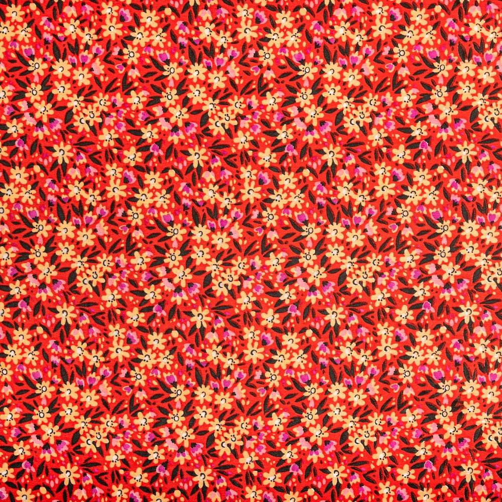 Gardenia Crepe De Chine Print fabric is a vibrant and contrasting colored floral printed fabric. All throughout the fabric, Gardenia Crepe De Chine Print fabric features 0.5" flowers and buds. Gardenia Crepe De Chine Print fabric is available in 3 colors: yellow, black, and red. Shop Gardenia Crepe De Chine Print fabric at wholesale prices. Gardenia Crepe De Chine Print fabric is sold by the yard, or in bulk by the roll.