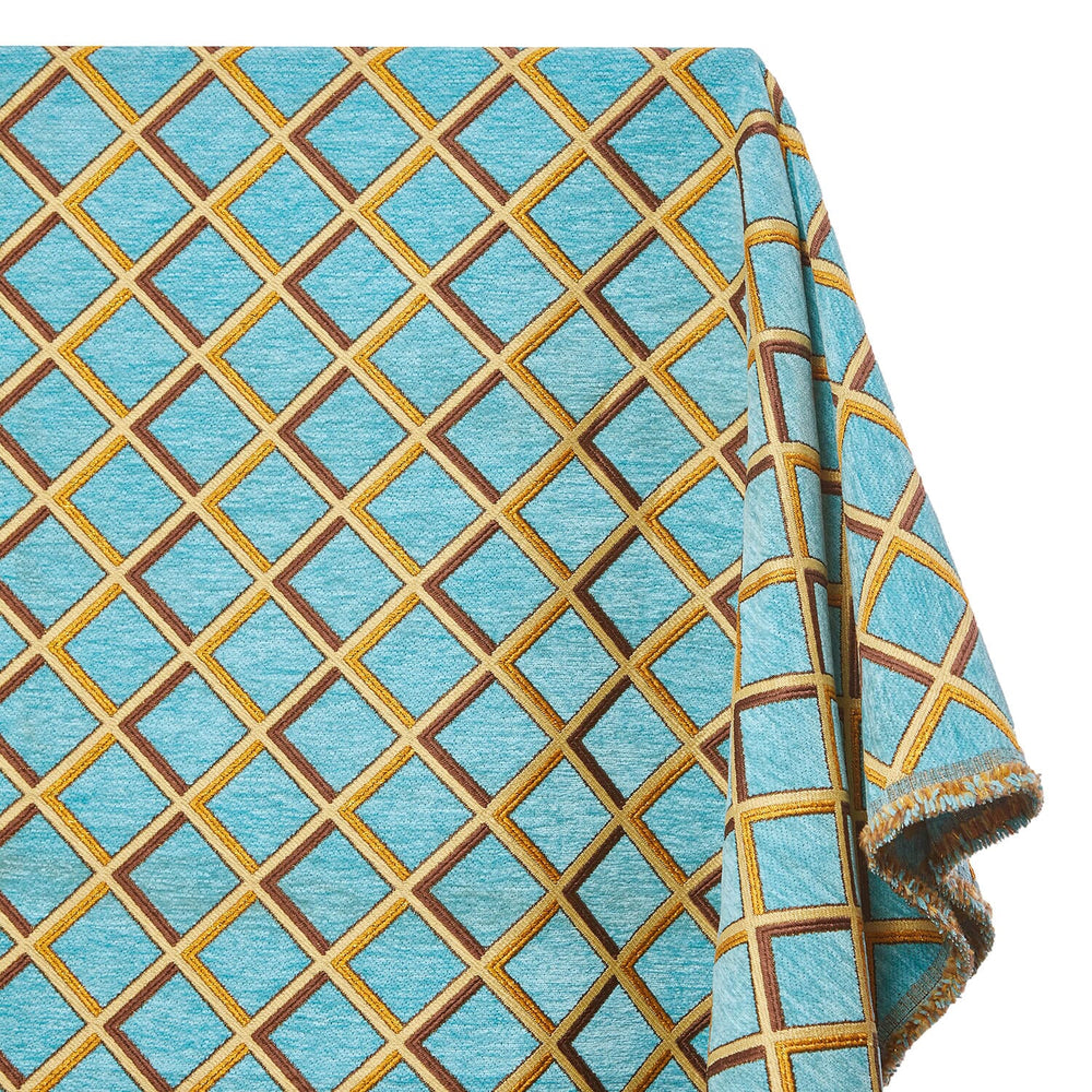Geometric Grid Metallic Chenille Upholstery Jacquard Fabric SV581282 Turquoise Gold A5