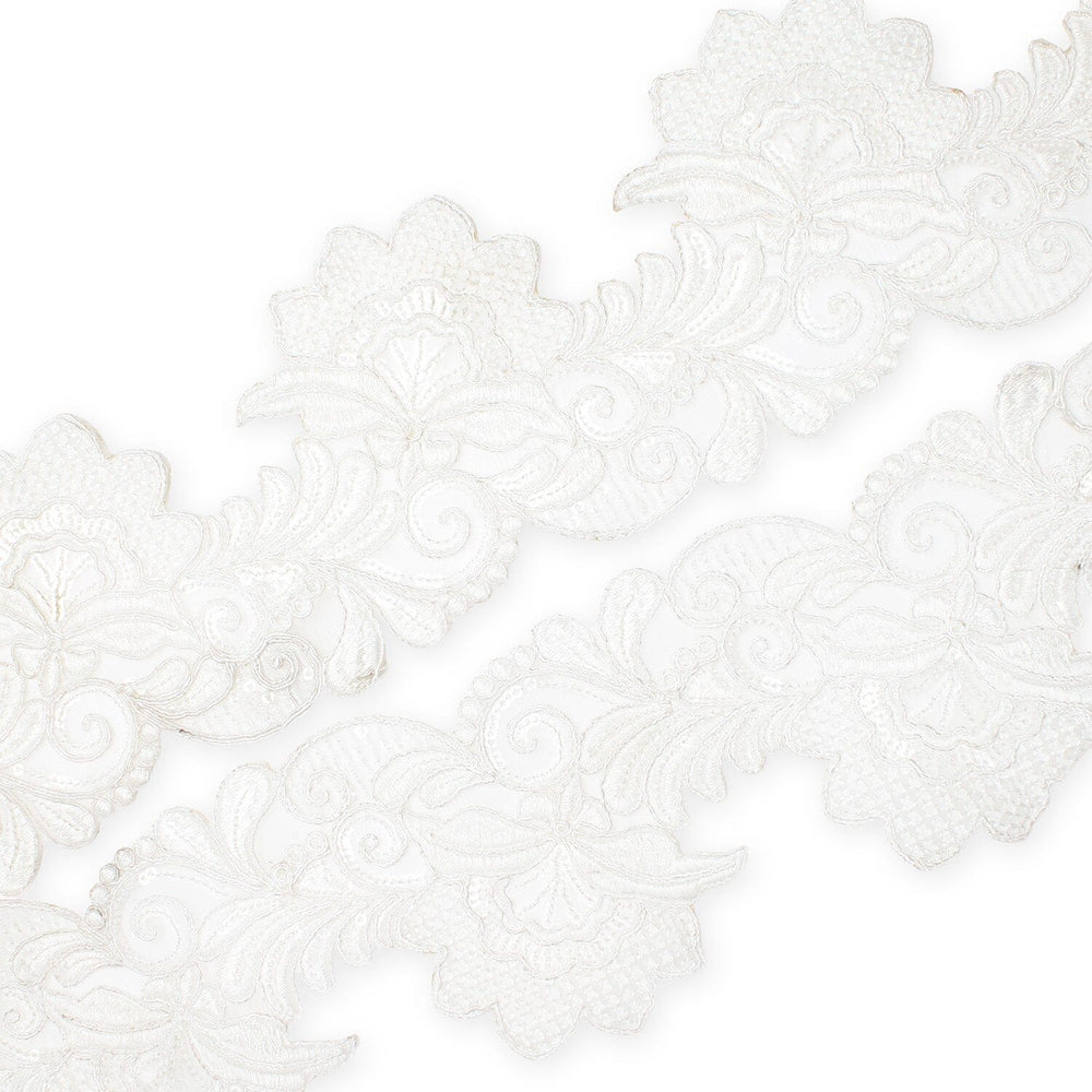 Leafy Floral Corded Sequin Embroidery On 4 Inch Scalloped Mesh Lace Trim is a sheer, lightweight, and shiny hem facing for fabric. Sourced from 100% polyester fibers, this trim displays a floral motif made of embroidery, sequins, cording, and scalloped edges. The lengthwise design on Leafy Floral Corded Sequin Embroidery On 4 Inch Scalloped Mesh Lace Trim has a 4-inch horizontal (parallel to the selvedge) pattern repeat. Measuring 2/4 inches wide, this trim is 1 millimeter thick, and is sold in 4.9-yard (4.5 meter) or 9.8-yard (9 meter) packs, which weigh approximately 4.7 ounces or 6.9 ounces respectively.
