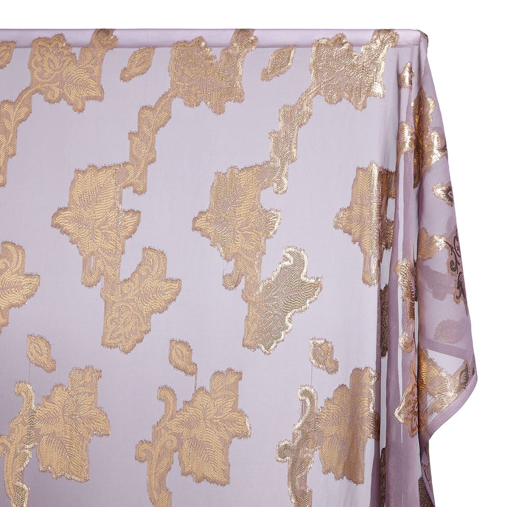 Leafy Vine Metallic Embroidered Chiffon is a lightweight, sheer, and lustrous fabric. Sourced from thin, 100% polyester fibers, this fabric is woven in an open, plain style making the fabric slightly see-through. Furthermore, this elegant fabric is embroidered with metallic fibers, which create a non-directional, floral leaf pattern which repeats every 6 inches vertically (measured selvedge to selvedge), and every 26 inches horizontally (measured parallel to the selvedge). Measuring 44/45 inches wide, Leafy Vine Metallic Embroidered Chiffon is 0.20 millimeters thick, has a 55 GSM, and weighs approximately 2.8 ounces per linear yard.