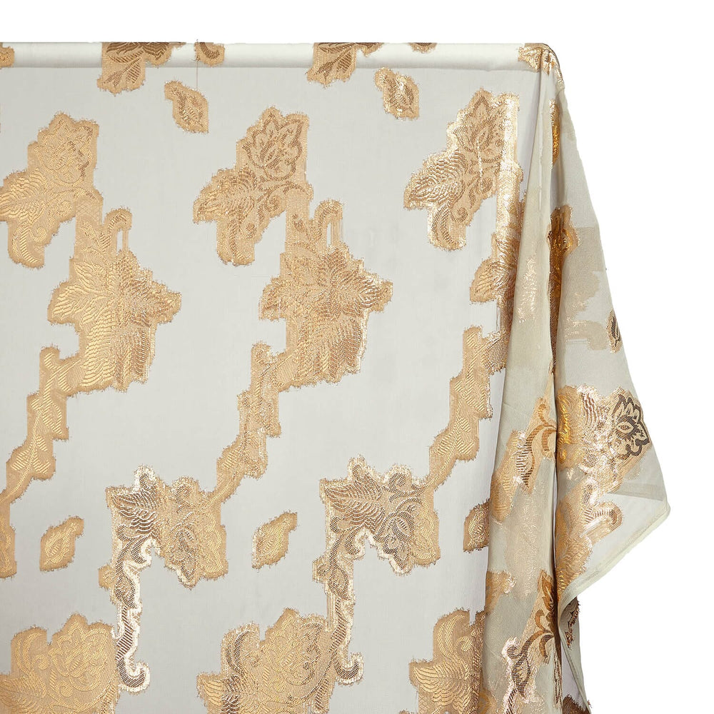 Leafy Vine Metallic Embroidered Chiffon is a lightweight, sheer, and lustrous fabric. Sourced from thin, 100% polyester fibers, this fabric is woven in an open, plain style making the fabric slightly see-through. Furthermore, this elegant fabric is embroidered with metallic fibers, which create a non-directional, floral leaf pattern which repeats every 6 inches vertically (measured selvedge to selvedge), and every 26 inches horizontally (measured parallel to the selvedge). Measuring 44/45 inches wide, Leafy Vine Metallic Embroidered Chiffon is 0.20 millimeters thick, has a 55 GSM, and weighs approximately 2.8 ounces per linear yard.