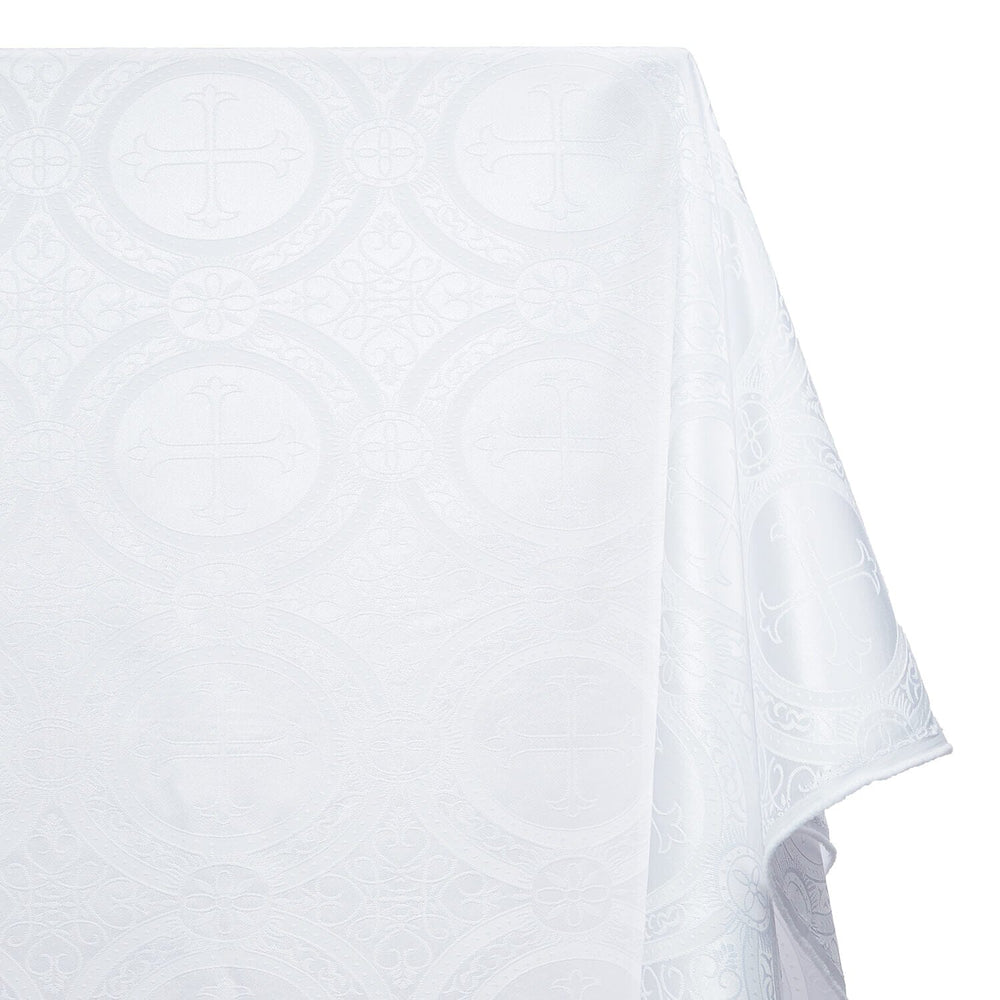 Liturgical Church Ecclesiastical Satin Jacquard Brocade is a shiny, subtly textured, medium-weight fabric featuring a detailed floral cross pattern. Woven from 100% polyester fibers, this fabric is Oeko-Tex® certified, meaning it is tested to be free from harmful levels of toxic substances, ensuring it is safe for human use and the environment. Additionally, Liturgical Church Ecclesiastical Satin Jacquard Brocade displays an elegant church-themed motif intricately built into the weave, which repeats every 7.5 inches vertically (selvedge to selvedge) and 6.5 inches horizontally. Measuring 58/60 inches wide, this material is 0.40 millimeters thick, has a 165 GSM, and weighs approximately 9.8 ounces per linear yard.