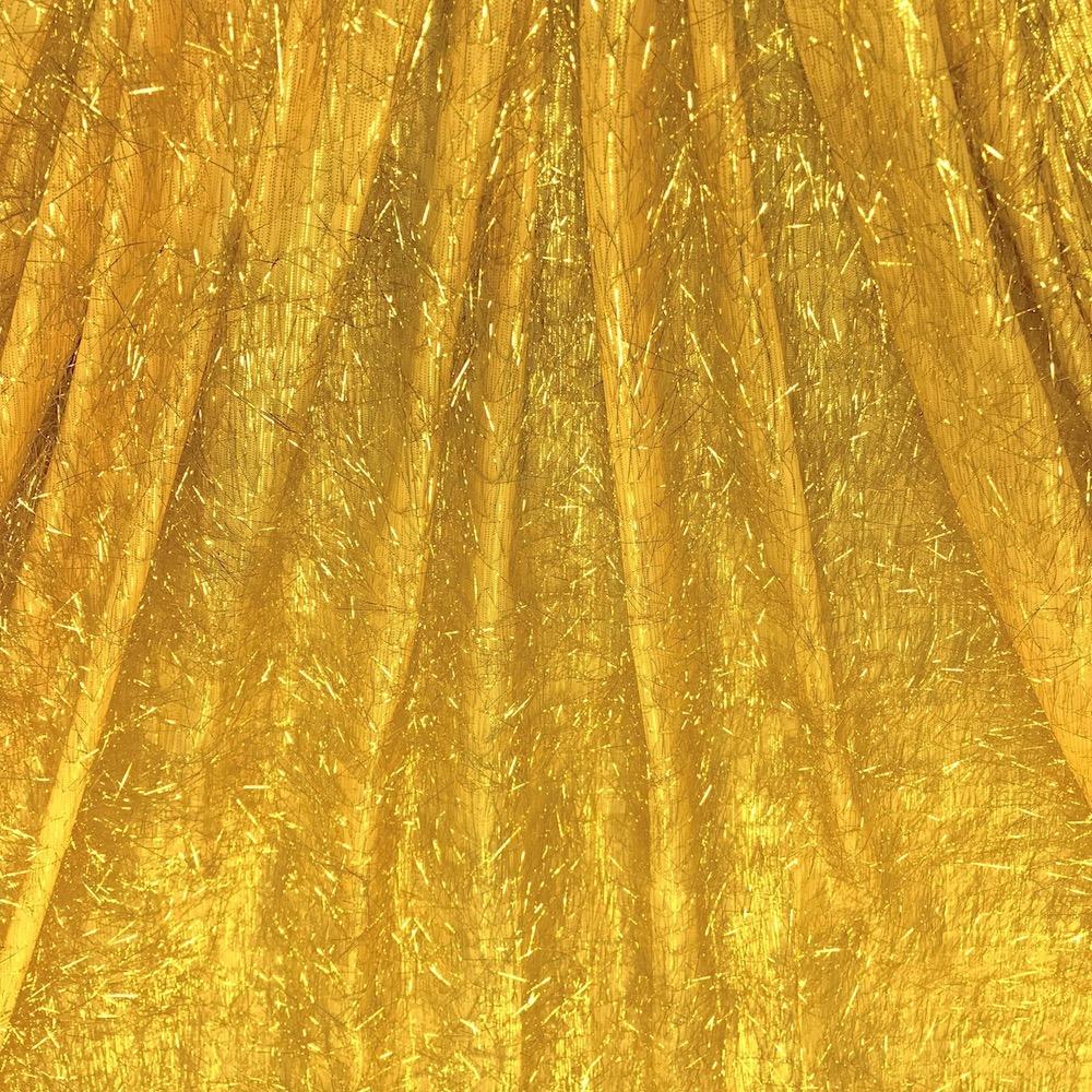 Metallic longhair eyelash uragiri lame is available in 44/45" and 55/56" widths. This lame fabric is composed of 100% polyester metallic uragiri fabric. This fabric has thin metallic polyester strips extending out from a polyester metallic underlay. This light weight fabric has beautiful bright sheen and a wonderful coarse texture.