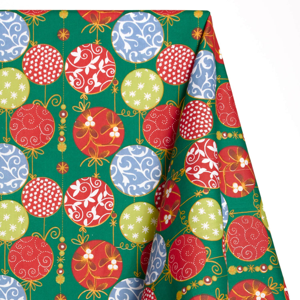 Ornament Print Broadcloth is a smooth and crisp fabric that displays a colorful, holiday ornament pattern. Woven in a broadcloth style, Ornament Print Broadcloth is sourced from a blend of 65% polyester and 35% cotton fibers. Being made from a blend means that this fabric is durable like polyester, but also breathable like cotton. Measuring 58/60 inches wide, Ornament Print Broadcloth fabric is 0.20 millimeters thick, has a 100 GSM, and weighs approximately 5 ounces per linear yard. Ornament Print Broadcloth has a smooth texture and a crisp drape when it’s hung. Furthermore, this fabric displays a vibrant holiday, ornamental pattern that measures 6 inches vertically, and 6 inches horizontally. Ornament Print Broadcloth is a versatile fabric that can be used for many applications.