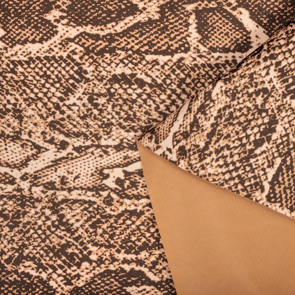 Ottertex® Waterproof Canvas - Snakeskin Print fabric is woven with 100% polyester fibers and measures 60/61" in width, 59/60" without the selvedge. This item is PFAS-free and has been updated with a PFAS-free coating. Ottertex® Waterproof Canvas - Snakeskin Print fabric features a 0.55mm thickness with PVC backing and a calculated 600 x 600 denier density.