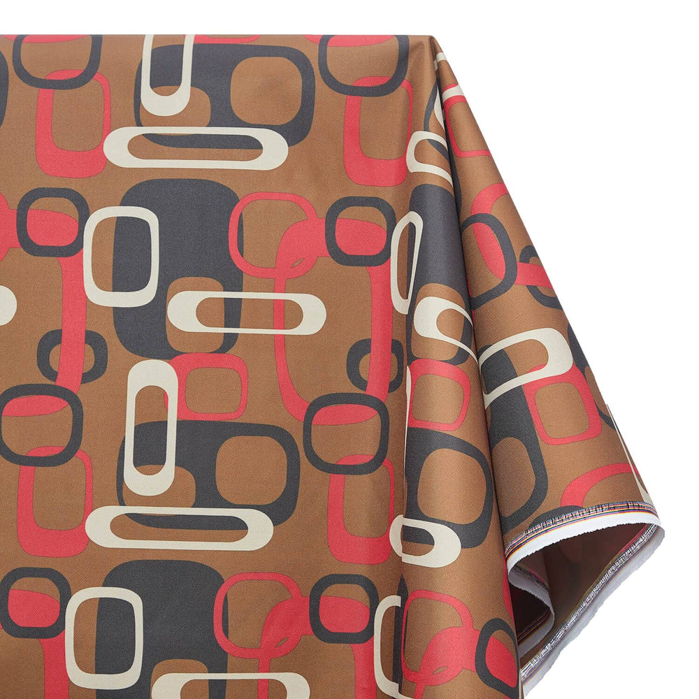 Ottertex® Waterproof Retro Print Canvas fabric is a subtly textured, durable, and heavyweight fabric that displays an abstract pattern. Sourced from 100% polyester fibers, this fabric features a PFAS-free, PVC (polyvinyl chloride) backing, which makes the material impermeable against liquid (suitable for strong storms and long exposure), in addition to resisting mold and UV (ultraviolet) rays. Ottertex® Waterproof Retro Print Canvas fabric features a vibrant retro themed, geometric pattern that repeats every 10 inches vertically, and every 12 inches horizontally. Measuring 61/62 inches wide, this pliable canvas fabric is 0.45 millimeters thick, has a 390 GSM, and weighs approximately 19.2 ounces per linear yard.