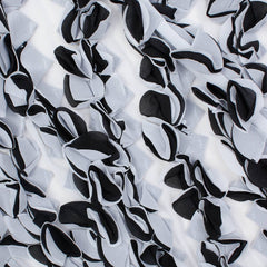 The Ruffled Bulbs Embroidered on Chiffon fabric has a 52" wide usable design on a 54" wide chiffon ground. The small sewed on "bulb" like design has a soft delicate touch. Although on a black colored ground, this fabric has a slight sheer and is lightweight. When this fabric is put to use, the bulbs flow elegantly and gives off that leafy ruffle resemblance. The luxurious chiffon does not stretch which means its easy to work with when sewing my hand or machine. The fabric is great for home/event decorations, costumes, dresses, table runners, backdrops and other apparel and craft projects!