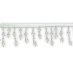 The base of Small Teardrop Beaded Rhinestone Tassel Fringe Trim is a 3/8 inch wide, 0.24-millimeter thick, shiny attachable ribbon. Connected to the ribbon are hanging teardrop-shaped rhinestones which alternate between 1 & 5/8 inch, 2 inch, and 1 & 1/4 inch length tassels. The tassel pattern on these trims repeat every 2 inches horizontally.