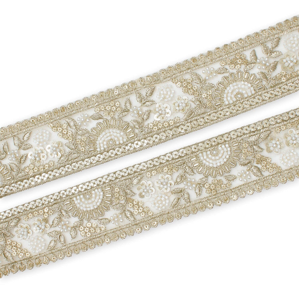 Sunshine Garden Floral Beaded Sequin Metallic Embroidery On 2 Inch Hemmed Mesh Lace Trim is a textured, sheer, and shiny, decorative fabric facing. This trim displays a floral motif, with a 3.75-inch horizontal (parallel to the selvedge) pattern repeat, that is made of beads and sequins, embroidered with metallic thread onto a polyester mesh lace backing. Sunshine Garden Floral Beaded Sequin Metallic Embroidery On 2 Inch Hemmed Mesh Lace Trim also features a 0.5-inch folded hem on both the top and bottom (parallel to the selvedge) for easy attachment. Measuring 2/3 inches in width, this trim is approximately 2 millimeters thick, and is sold in 4.9-yard (4.5 meter) or 9.8-yard (9 meter) packs, which weigh approximately 5.4 ounces or 10.7 ounces respectively.