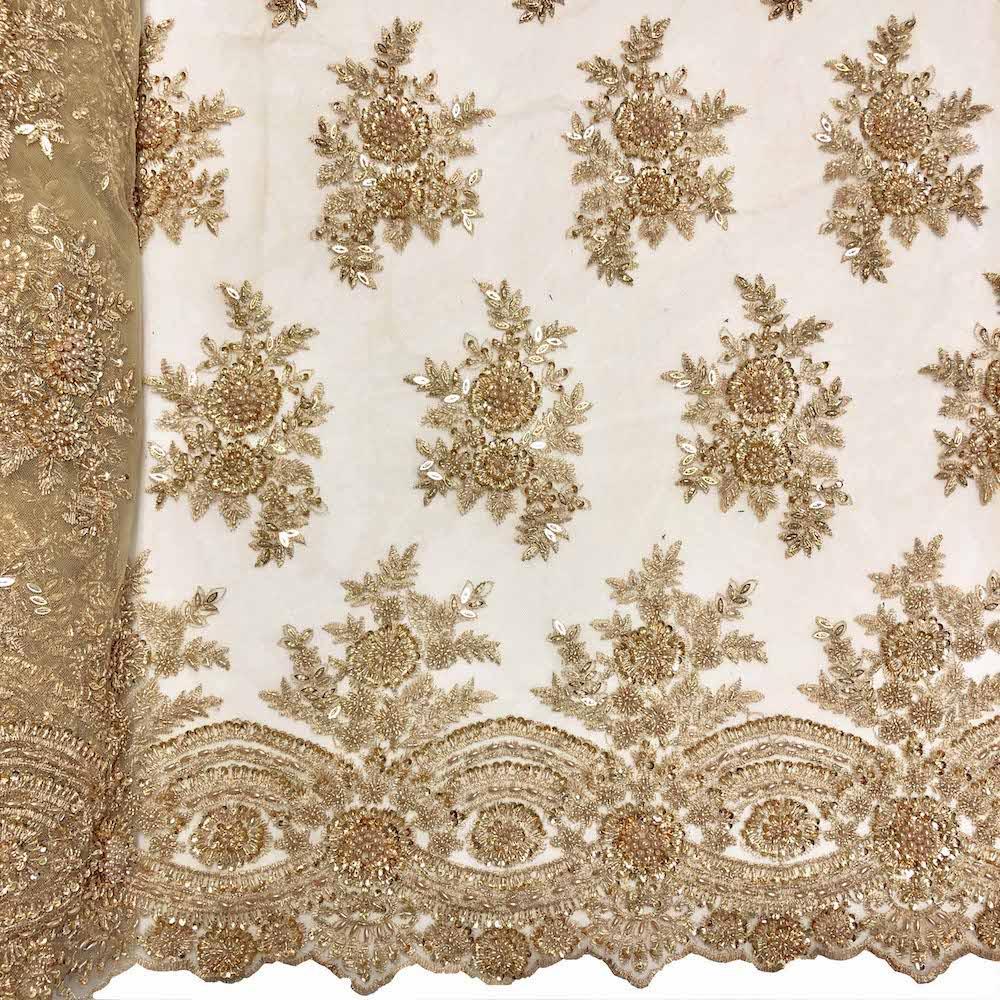 Viburnum bridal lace fabric is 52/53'' inches wide and 100% polyester. This is a high quality, heavy weight fabric that is extremely elegant and durable. This beaded fabric is hand crafted and features an array of beads that are precisely sewn together to create an elegant design on the mesh underlay. It also has beautiful scallop edges that are finished on both sides of the fabric.