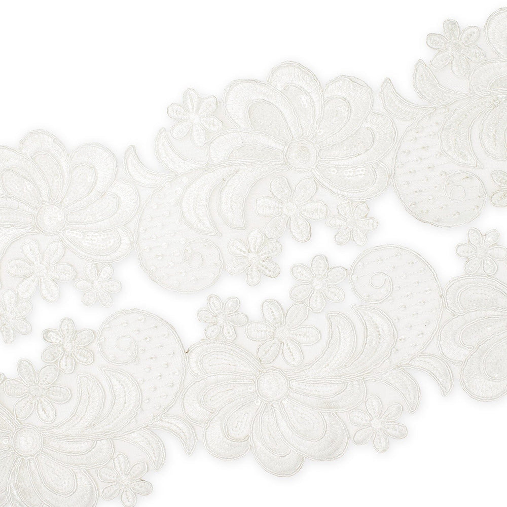 Sold by the pack, shop Wild Flower Corded Sequin Embroidery On 4 Inch Scalloped Mesh Lace Trim online at wholesale prices today!